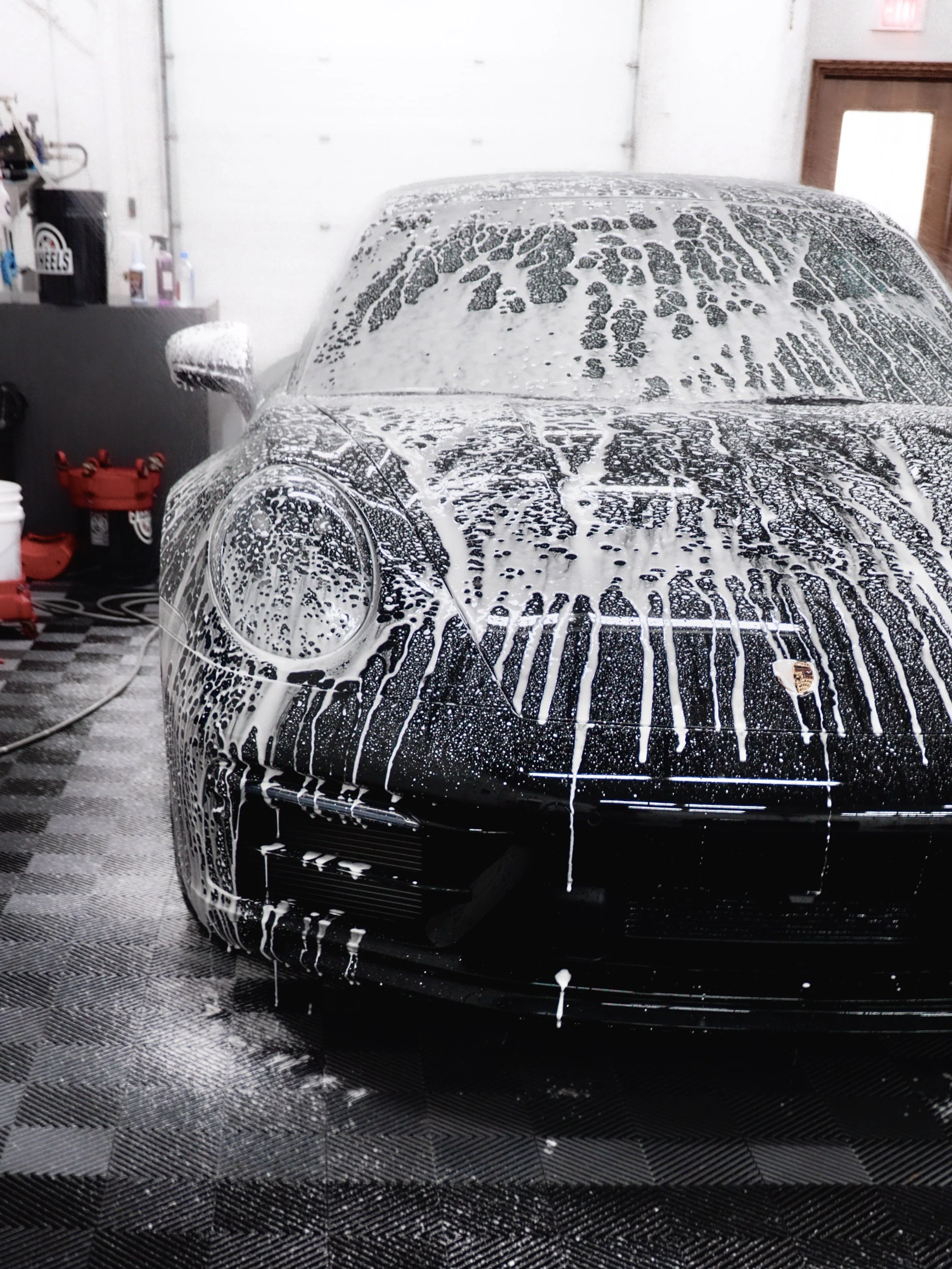Finally, a high-pressure rinse and soft wash mitt shampoo are applied, followed by a drying aid for protection.